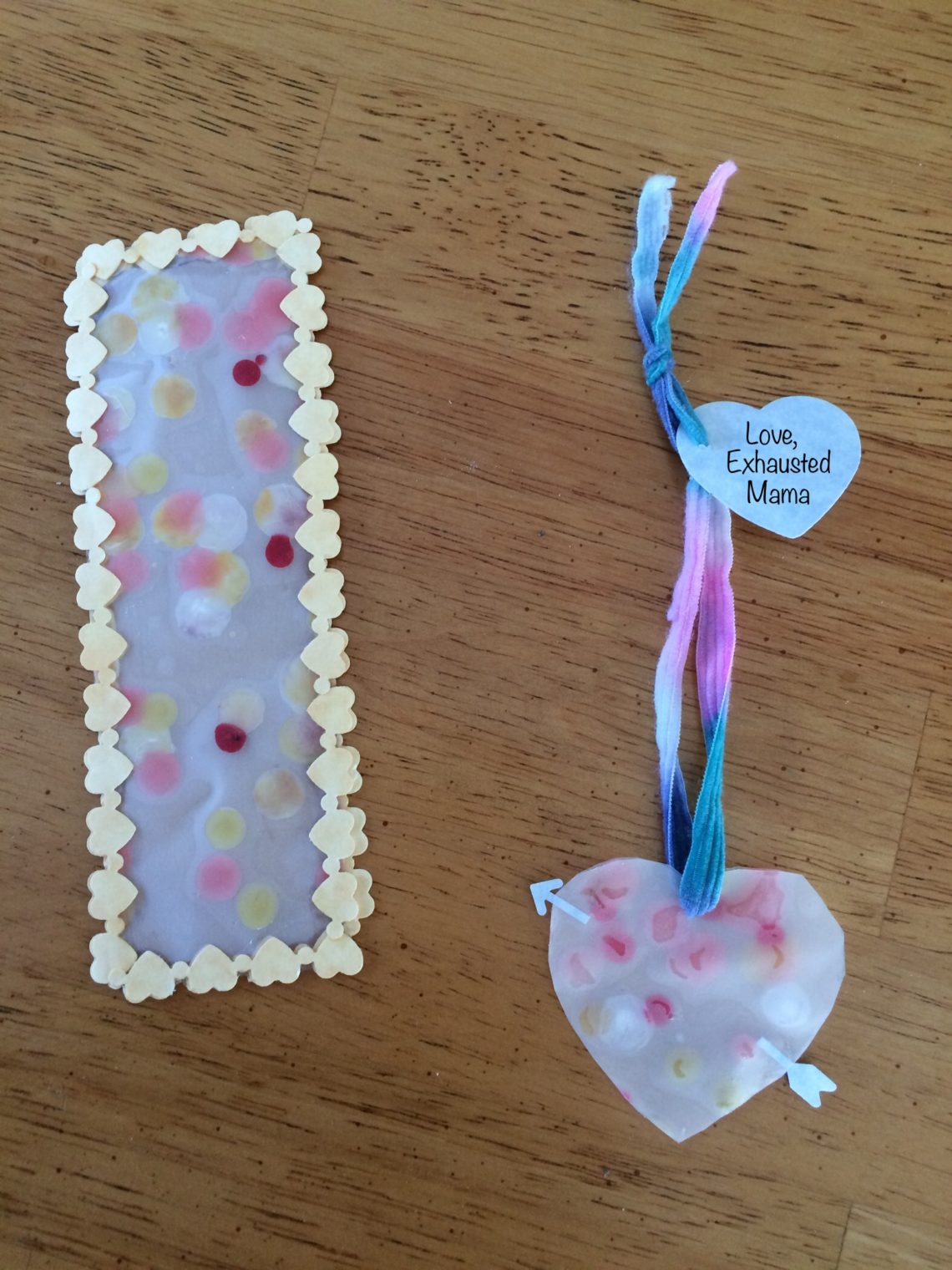 With Valentine’s Day in just a few days, I wanted to get the girls’ valentines figured out this past weekend. They go to a school where valentines need to be homemade, if they are brought in. After talking with my first grader, we decided to make some suncatchers by dripping candle wax onto a clear sheet of adhesive paper. My fifth grader walked in while we were doing this and immediately wanted in on the action. She, however, decided she was going to turn hers into bookmarks. This is how they turned out. Disclaimer: This is not a project for children to do on their own as a lit candle is…